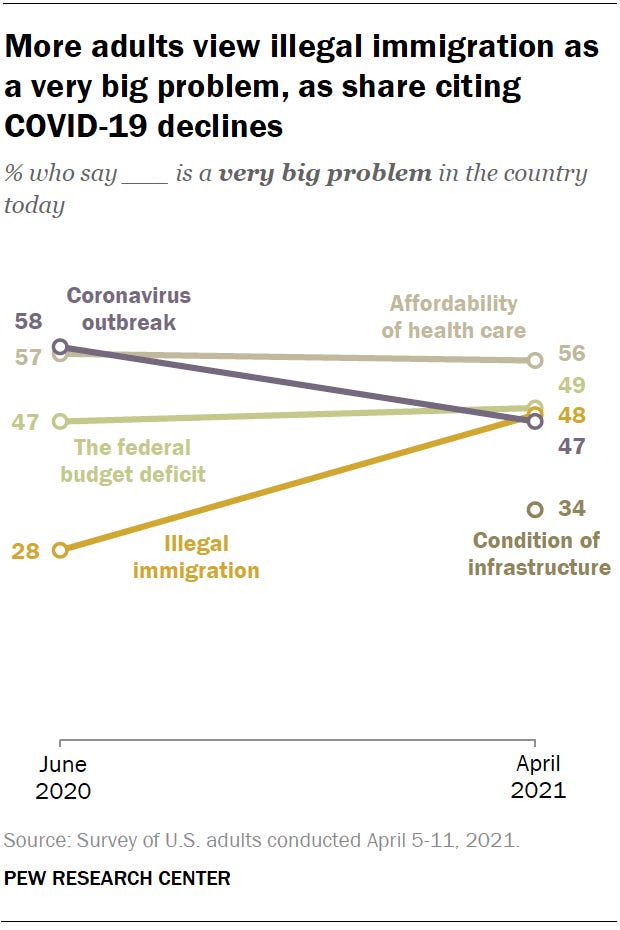 Less than half (47%) of Americans now say COVID is a “very big problem”, an 11 point drop since June; “illegal immigration” concerns saw the largest increase over the same time period, split largely along political lines with 72% of GOP and 29% of Dems now considering it a “very big problem” (Pew)