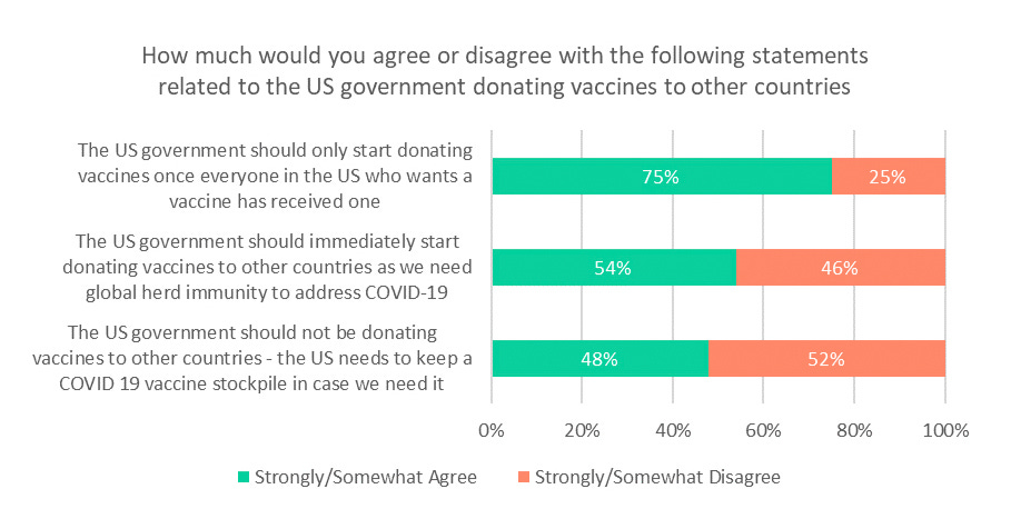 The majority of Americans (75%) believe they should be vaccinated before the US donates COVID-19 shots globally, while 54% at least somewhat agree we should immediately begin donating and slightly less (48%) believe we should instead stockpile (STAT/Harris)