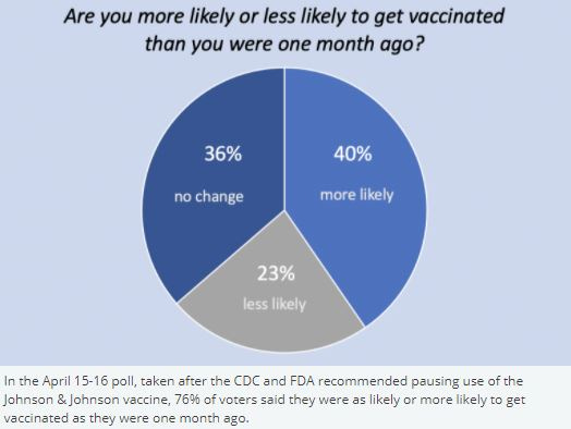 According to a de Beaumont Foundation Poll, vaccine confidence continues to rise despite the temporary J&J pause, with 76% of American voters saying they’re as likely or more likely to get vaccinated vs one month ago (de Beaumont)