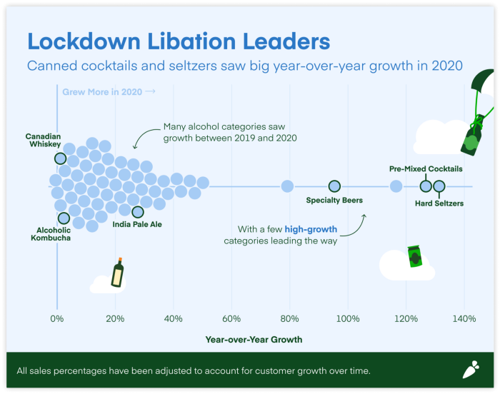 Instacart also revealed the extent to which Americans looked towards the online alcohol aisle to relieve stress in 2020, with nearly all alcohol categories growing YoY (Instacart)