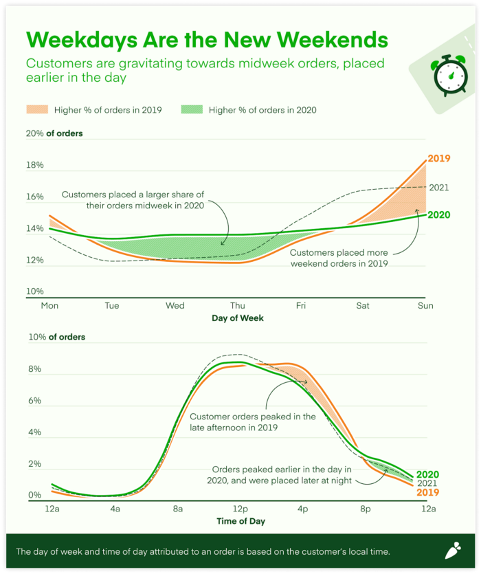 Early analysis of 2021 shows a meaningful portion of shoppers are continuing this new midweek routine, and 77% of Instacart-ers said they’re likely to continue buying groceries online post-COVID (Instacart)