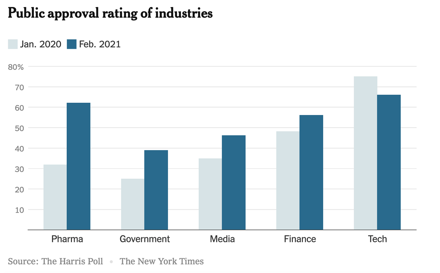 Public approval of Big Pharma has dramatically increased from YAG, with 62% of Americans now viewing the industry in a positive light (Harris/Gallup)