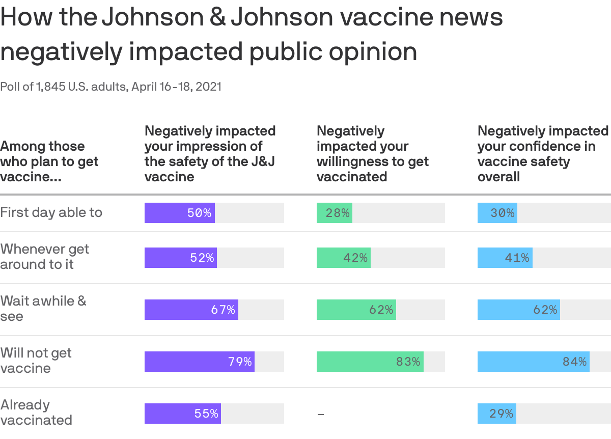 A Harris Poll showed the pause in a less positive light: 54% of respondents said they would not take the J&J vaccine, and 62% of those that were already skeptical of vaccines (the “wait awhile and see” group below) said the pause has reduced their confidence in vaccine safety overall (Harris/Axios)
