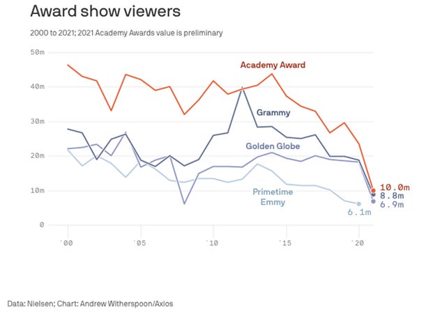 The 93rd Academy Awards was the least watched in history with an audience of ~10.4MM, a 58% drop from the 2020 Oscars ceremony (Deadline)