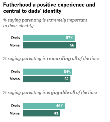 Dads need love too. Fathers play a much larger role today than they did 50 years ago and the number of stay-at-home dads has increased 70% since 1989 to 7%. In dual parent households women still take the lion's share of responsibility for household chores and child care, but fathers today don’t show any less of a desire to engage with their children, pointing to a unique set of barriers (lack of confidence, pressure to provide, etc.) perpetuated by social and gender norms that could be holding them back.